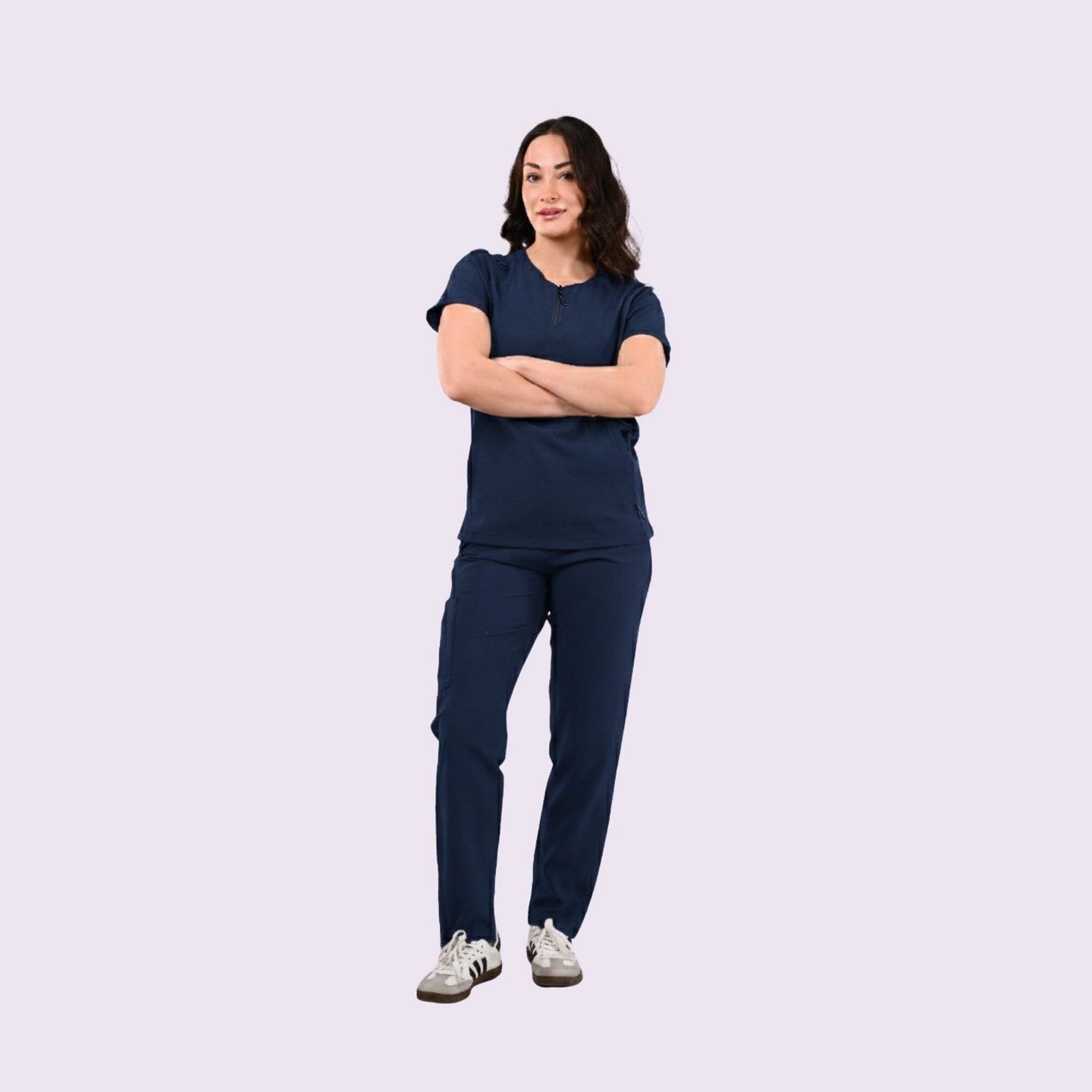 The top features a unique zip-neck design with a modesty placket for adjustable coverage, princess seams for a feminine shape, and curved pockets for a polished look. Paired with the pants’ natural-waisted drawstring design and tapered legs, this set ensures elegance meets high performance. Crafted from eco-conscious materials, it pushes boundaries in healthcare fashion—delivering confidence, comfort, and style. Embrace the future with a set that’s always elevating and forward-thinking.