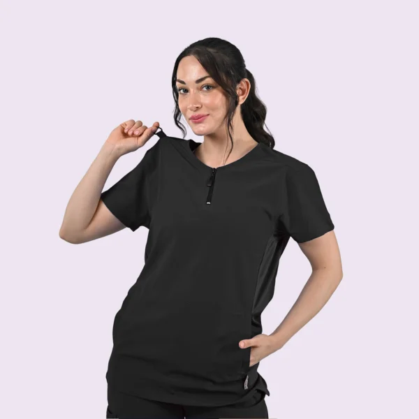Here’s how to add something different to your scrub lineup: our neck-zip scrub top has a curved neckline that unzips to reveal a modesty placket. Ever-flattering princess seams and curved pockets make for a perfect fit. Each piece in our Comodo stretch scrub collection was designed for 12+ hour shifts and made from easy-care, 4-way stretch comfort fabric.